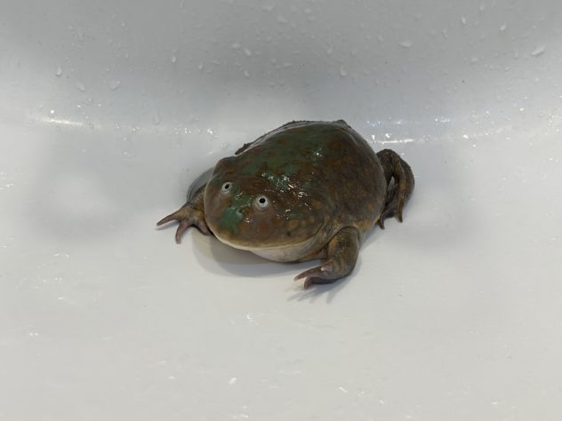 水替え待機中のたまちゃんです。 目と目の間の緑色の部分がチャームポイント。 目の近さは誰にも負けません。? 普段は水中で生活していますが、水から出ると水饅頭になります。