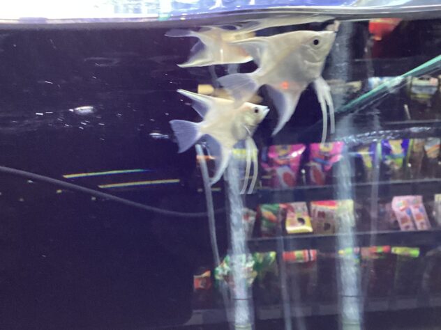 真っ白いエンゼルフィッシュちゃんです。人工餌もよく食べて元気でかわいい子です。