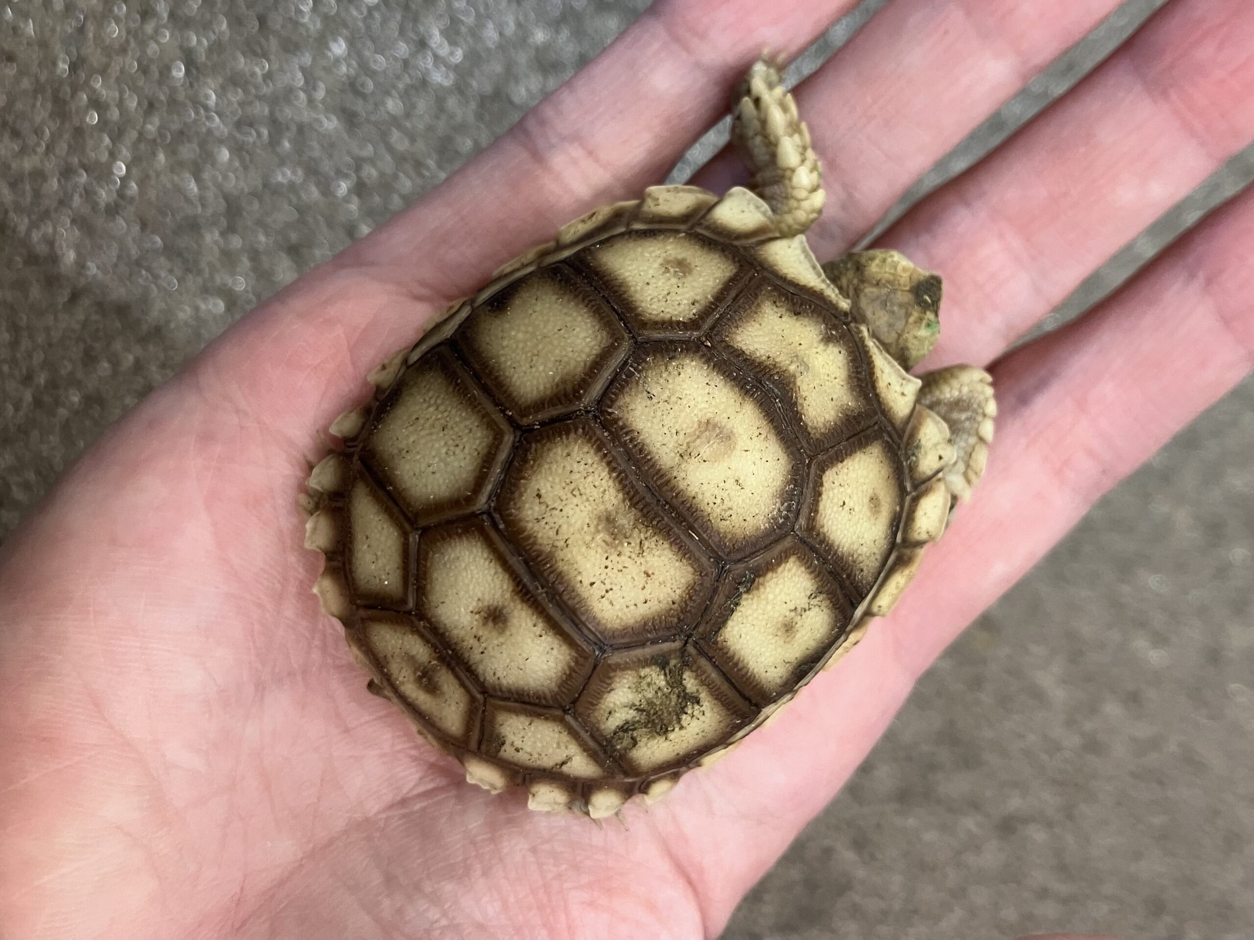 写真の子はケヅメリクガメです!いまはてのひらサイズですが、おっきくなりますよ!